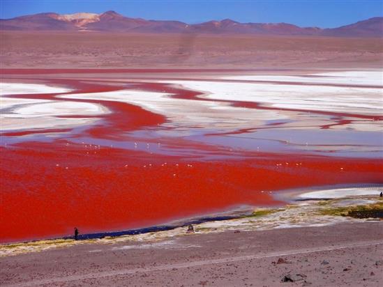Hồ Lago Colorada ở Bolivia là hồ chứa nước màu đỏ, khiến nhiều người liên tưởng nó như một khu vực trên sao Hỏa. Nguyên nhân tạo nên màu đỏ của hồ là do lớp trầm tích lắng đọng và một loại tảo. Hồ có những đảo muối borax trắng xóa. Đây cũng là nơi tập trung rất nhiều giống chim hồng hạc quý hiếm. Ảnh: Wordpress.