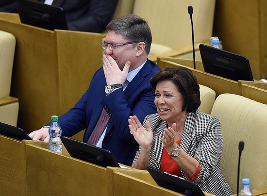Ông Andrei Isayev (trái), đại biểu đại diện Ủy ban Lao động và Thương binh, Xã hội lấy tay che miệng cười tủm tỉm còn bà Irina Rodnina (phải), phó chủ tịch Ủy ban Đối ngoại của Hạ viện, vỗ tay tán thưởng bên lề một cuộc họp.