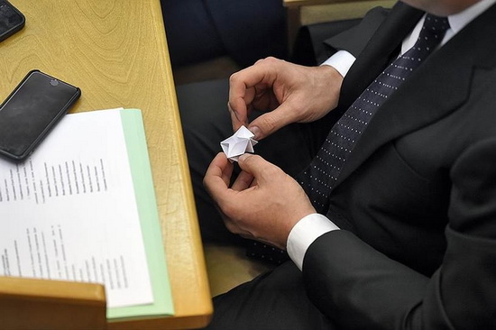 Tuy nhiên cũng có những nghị sĩ làm việc riêng trong giờ họp. Trong ảnh là một nghị sĩ bị phóng viên bắt gặp đang luyện nghệ thuật gấp giấy Origami giữa phiên họp.