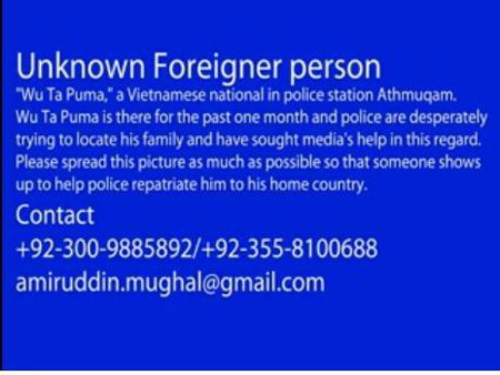Cảnh sát ở thị trấn Athmuqam, Pakistan đã quay, chụp các tư thế của một người đàn ông tên Wu Ta Puma với mong muốn cộng đồng truyền thông giúp nhận dạng và xác minh nhân thân để người này sớm đoàn tụ với gia đình.