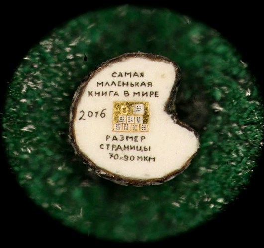 Vladimir Aniskin, một nhà khoa học Nga đến từ thành phố Novosibirsk, đã tạo ra cuốn sách nhỏ nhất thế giới. Kích thước chính xác của cuốn sách đó là 0,07x0,09 mm. Cuốn sách tí hon này được đặt trên một tấm vàng dát mỏng và nằm giữa hạt hoa anh túc. Ảnh: RBTH.