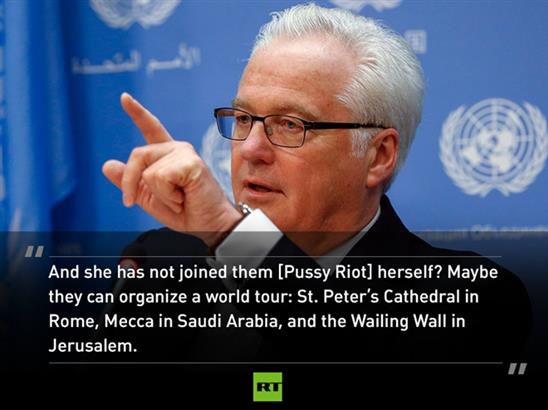 Churkin đáp lại lời đại sứ Mỹ Samantha Power khi bà  lên tiếng về việc gặp mặt các thành viên của nhóm Pussy Riot hôm 6-2-2014. Các nhà hoạt động vốn nổi tiếng tại Nga và phương Tây sau khi ba thành viên của họ bị bắt giữ tại Nga do những hành động quấy phá "kinh hoàng" của mình tại Nhà thờ Đấng cứu thế tại Moscow năm 2012.