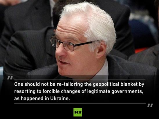 "Không ai được thay đổi các vấn đề địa chính trị bằng cách sử dụng các biện pháp vũ lực, giống như cái cách mà một chính phủ hợp pháp ở Ukraine bị lật đổ."Phát biểu tại Đại hội đồng LHQ vào ngày 11-5-2016, ông Churkin kêu gọi các nhà lãnh đạo thế giới phải nhớ nguyên tắc sáng lập của tổ chức.