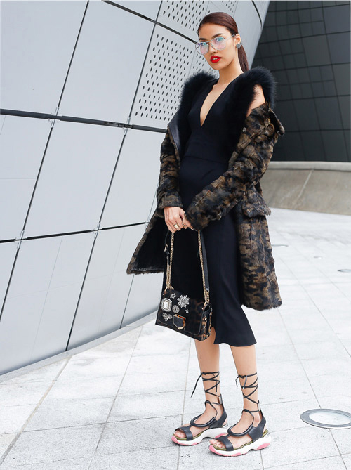 Lan Khuê "chất lừ" tại Tuần lễ thời trang Seoul. Cô chọn váy hiệu Salvatore Ferragamo, áo khoác Versus Versace, giày Salvatore Feragamo, túi Jimmy Choo và mắt kính Chanel.