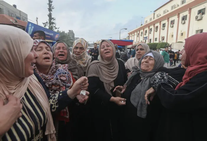Phụ nữ Palestine than khóc khi người thân thiệt mạng do không kích ở Khan Younis, Gaza ngày 22/10. Ảnh: NYT