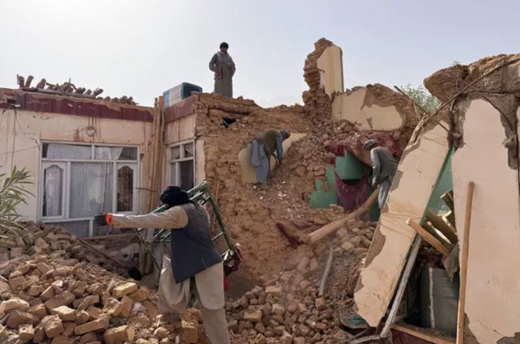 Người dân địa phương giữa đống đổ nát của ngôi nhà sập sau trận động đất 6,3 độ richter ở miền bắc Afghanistan, ngày 3 tháng 11 năm 2025. © AP Photo / Sirat Noori