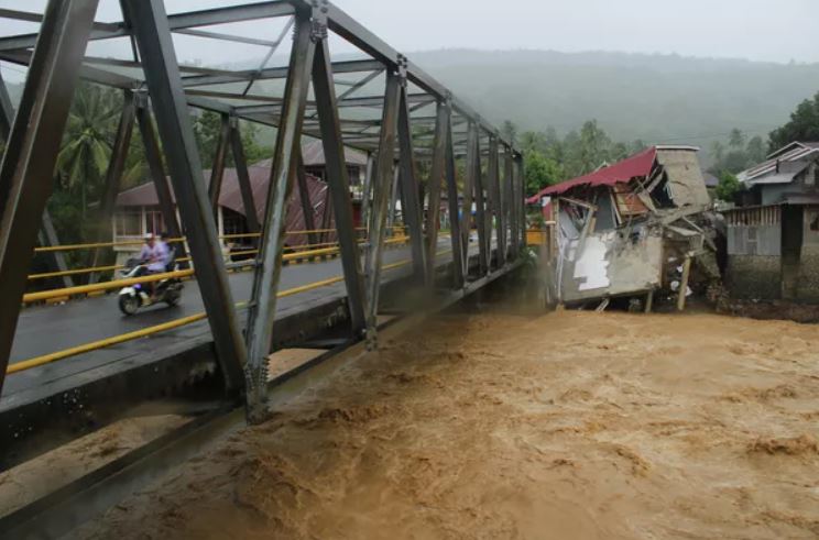 Tài xế ô tô đi qua cầu cạnh những tòa nhà bị hư hại do lũ lụt ở Tanah Datar, Tây Sumatra, Indonesia, thứ Sáu, ngày 28 tháng 11 năm 2025. © AP Photo / Ali Nayaka