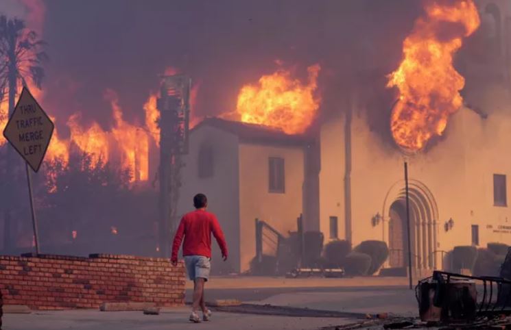 Người đàn ông đi ngang qua nhà thờ Altadena Community đang bốc cháy dữ dội do