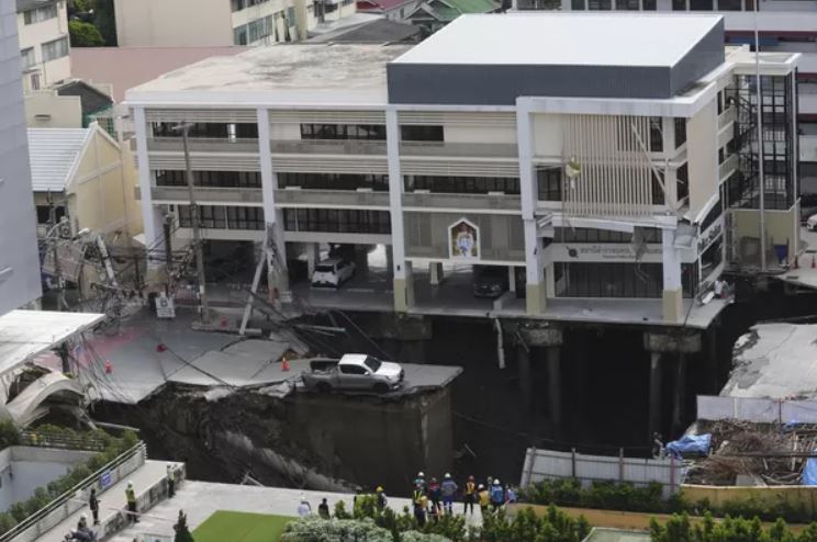 Hậu quả sau vụ sụt lún đường gần bệnh viện Vajira ở Bangkok, Thái Lan,