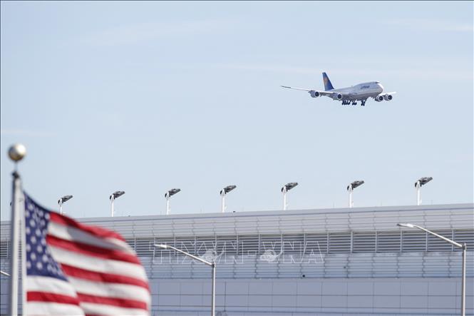 Máy bay Boeing 747-8 của hãng hàng không Lufthansa hạ cánh xuống sân bay quốc tế O'Hare ở Chicago, bang Illinois, Mỹ. Ảnh: AFP/TTXVN