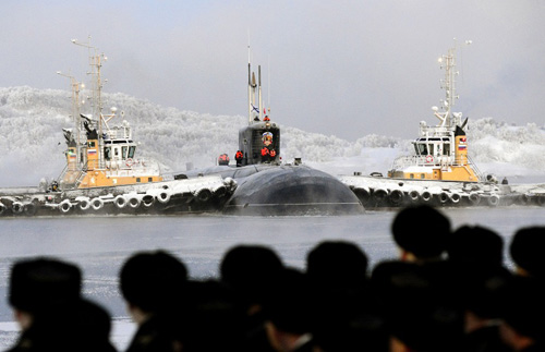 Tàu ngầm năng lượng hạt nhân thế hệ thứ 3 lớp Borei mang tên Vladimir Monomakh tại căn cứ của Hạm đội Biển Bắc.