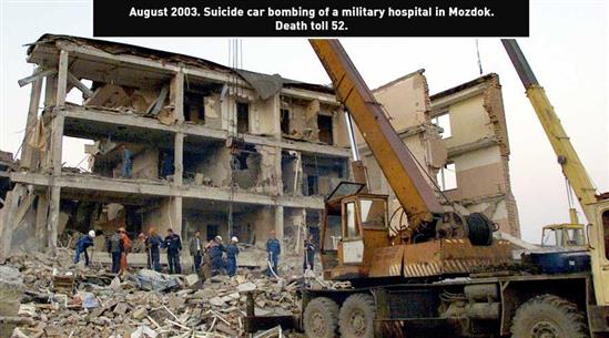 Ngày 01/ 8/2003: Một chiếc xe tải chở 10 tấn thuốc nổ đã lao vào một bệnh viện quân sự ở Mozdok, Bắc Ossetia, và san phẳng tòa nhà chính. Vụ nổ khiến 52 người thiệt mạng, trong đó có các binh sĩ đang được điều trị và nhân viên bệnh viện.