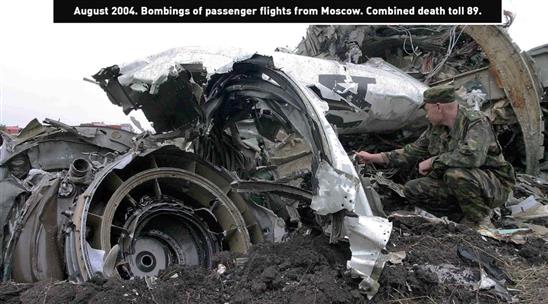 Ngày 24/8/2004: Hai máy bay đi từ Moscow tới Volgograd và Sochi đã bị hai kẻ đánh bom liều chết tấn công. Tổng cộng 89 người đã thiệt mạng. Thảm họa này cho thấy lực lượng an ninh ở sân bay Domodedovo (Moscow) khi đó đã lơ là trách nhiệm. Những kẻ đánh bom lên được máy bay mà không hề bị kiểm tra hay xuất trình giấy tờ.