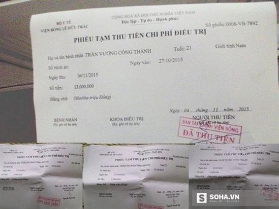 Những tờ phiếu tạm thu tiền chi phí điều trị hàng ngày của Thành.