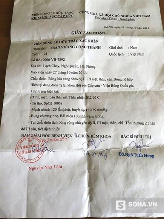 Dù bị đau nhưng ngay tức khắc, Thành vẫn kịp dùng xe máy chở bố đến bệnh viện Việt – Tiệp sơ cứu, rồi sau đó chuyển lên Viện bỏng Quốc gia.