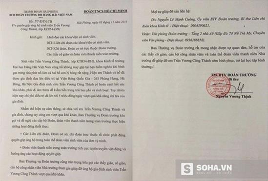 BCH Đoàn trường ĐH Hàng Hải phát động chương trình ủng hộ sinh viên Trần Vương Công Thành.