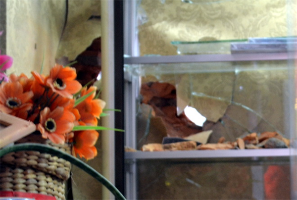 Vụ nổ làm vỡ vụn nhiều vật dụng, đồ trang trí trước hai cửa hiệu, văng ra đường Phan Chu Trinh. Có một số vết thủng trong tường phía trong nhà, trong đó có hai vết thủng lớn xuyên tường khiến vôi vữa, mảnh gạch rơi vung vãi trong cửa hiệu băng đĩa. Kiếng trong hai cánh cửa sắt nơi lối đi vào cũng có một số vết thủng tròn. Một chiếc xe hiệu Dream ngã nghiêng ngay trước hiên nhà.