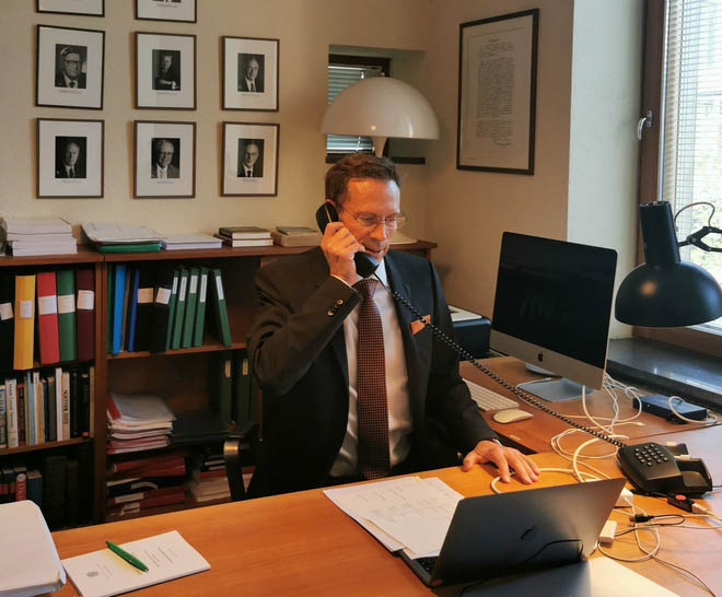 Thư ký Ủy ban Nobel Thomas Perlmann báo tin mừng cho nhà khoa học được trao giải Nobel Y Sinh 2020. Bức ảnh được công bố trước lúc công bố người đạt giải. Ảnh: Ủy ban Nobel.