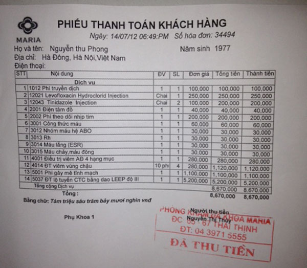 Theo thông tin chúng tôi có được, chị Phong thanh toán tiền khám, điều trị vào khoảng 18h49’ ngày 14/7, được chỉ định truyền 3 chai dịch, làm điện tâm đồ và một số thủ thuật khác. Tổng số tiền mà nạn nhân đã bỏ ra lên tới gần 9 triệu đồng.
