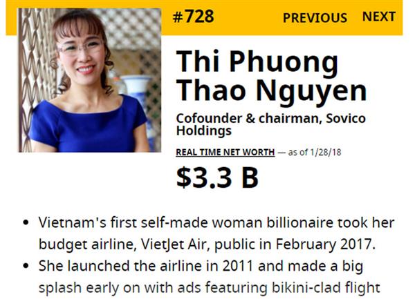 Trong bảng xếp hạng, bà Nguyễn Thị Phương Thảo vượt trên bà Hillary Clinton và tiếp tục bỏ xa cựu ứng cử viên Tổng thống Mỹ nhờ vào khối tài sản tăng không ngừng khi VietJet liên tục báo cáo kết quả kinh doanh ấn tượng và Ngân hàng HDBank của nhà bà Thảo lên sàn.