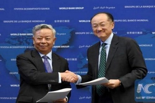 Chủ tịch Ngân hàng Đầu tư Cơ sở hạ tầng Châu Á (AIIB) Jin Liqun và Chủ tịch Ngân hàng Thế giới (WB) Jim Yong Kim. Ảnh: Tân Hoa Xã.