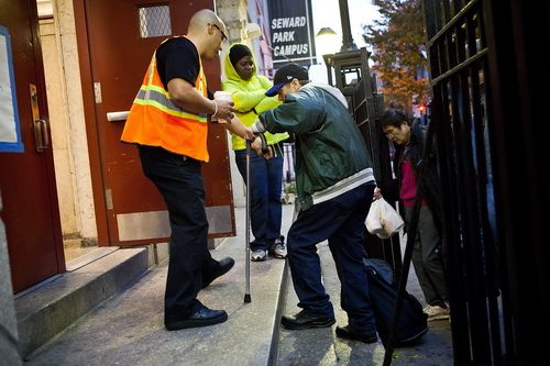 Hàng người sơ tán vào Trường trung học Seward Park tại thành phố New York để tránh bão