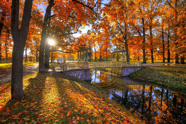 Nhiệt độ trung bình mùa thu ở cố đô Saint Petersburg dao động khoảng 8 độ C vào ban ngày và 3 độ C vào ban đêm, với mưa thường xuyên. Vào ngày nắng, Saint Petersburg cũng lộng lẫy trong màu vàng rực rỡ của những tán lá phong và bạch dương. Hai địa điểm được nhiều du khách yêu thích nhất khi đến cố đô nước Nga là Cung điện mùa hè Peterhof và Cung điện mùa thu Catherine. Ảnh: Pinterest.