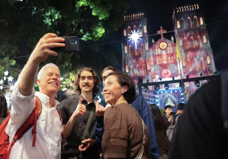 Du khách nước ngoài ghi lại khoảnh khắc chờ đón Giáng sinh 2025 tại quảng trường trước Nhà thờ Lớn. © Ảnh : TTXVN - Hoàng Trung Hiếu