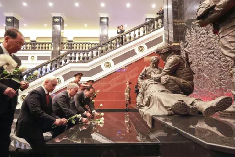 Bộ trưởng Quốc phòng Triều Tiên, Đại tướng No Gwang-chol, Bộ trưởng Quốc phòng Nga Andrei Belousov và Chủ tịch Duma Quốc gia Liên bang Nga Vyacheslav Volodin tại lễ khai trương tổ hợp Bảo tàng và Khu Tưởng niệm ở Bình Nhưỡng, dành tôn vinh chiến công của