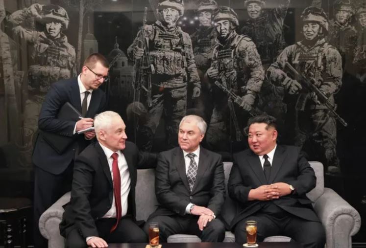 Bộ trưởng Quốc phòng Nga Andrei Belousov, Chủ tịch Duma Quốc gia Nga Vyacheslav Volodin và Tổng Bí thư Đảng Lao động Triều Tiên kiêm Chủ tịch Triều Tiên Kim Jong-un (từ trái sang phải, hàng trước) tại cuộc gặp ở Bình Nhưỡng. © Sputnik / Russian State Duma Press service