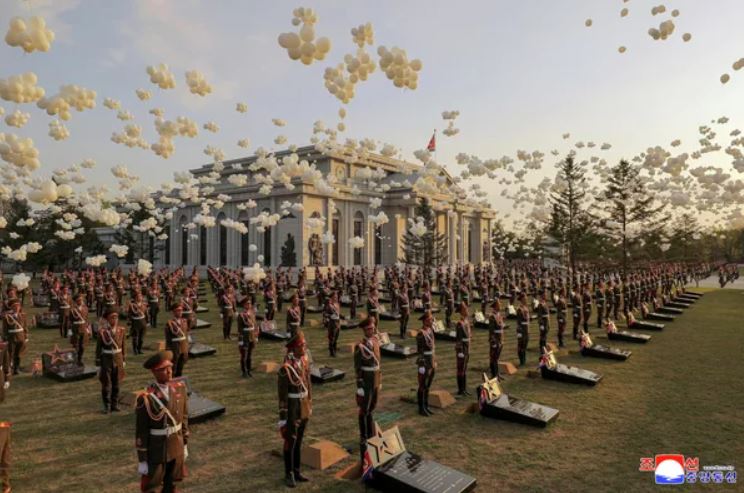Những quả bóng bay lơ lửng trên không trung, và các quân nhân đứng nghiêm bên cạnh bia tưởng niệm trong lễ khai trương tổ hợp Bảo tàng và Khu Tưởng niệm dành tôn vinh chiến công của các anh hùng trong chiến dịch quân sự ở nước ngoài. © REUTERS KCNA