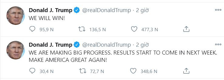 Không rõ nhà lãnh đạo Mỹ đang nói về "các kết quả" gì, nhưng hiện tại đội ngũ của ông đang thực hiện cuộc chiến pháp lý tại nhiều bang mà phe ông Trump nghi ngờ có gian lận bầu cử. Ông Trump tiếp tục viết trên Twitter: "Chúng tôi sẽ chiến thắng".