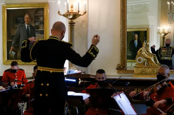 Ảnh chân dung của cựu Tổng thống George W. Bush được nhìn thấy ở bên trái, khi các thành viên của Ban nhạc Thủy quân Lục chiến Mỹ chơi nhạc lễ trong chuyến tham quan về đồ trang trí Giáng sinh của Nhà Trắng vào tháng 11/2021. Ảnh: Reuters.