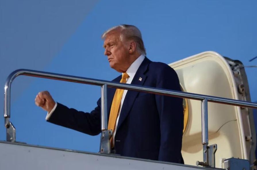Tổng thống Mỹ Donald Trump ra hiệu khi ông bước xuống chiếc Không lực Một tại Sân bay Haneda ở Tokyo, Nhật Bản, cho điểm dừng chân thứ hai trong chuyến công du châu Á của ông, ngày 27/10. Ảnh: Reuters.