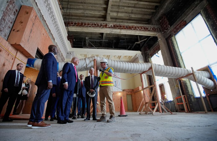 Ngay sau khi đến, ông Trump và người đứng đầu ngân hàng trung ương đã cùng nhau tham quan công trường. Cả hai đều đội mũ bảo hộ màu trắng.
