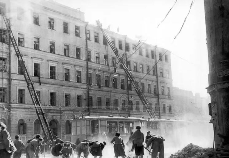 Dọn dẹp đống đổ nát sau trận oanh tạc của máy bay Đức không kích vào Leningrad. Trong trận ném bom của quân phát-xít ngày 13/05/1943, toà nhà ở số 174 Đại lộ 25 Tháng Mười