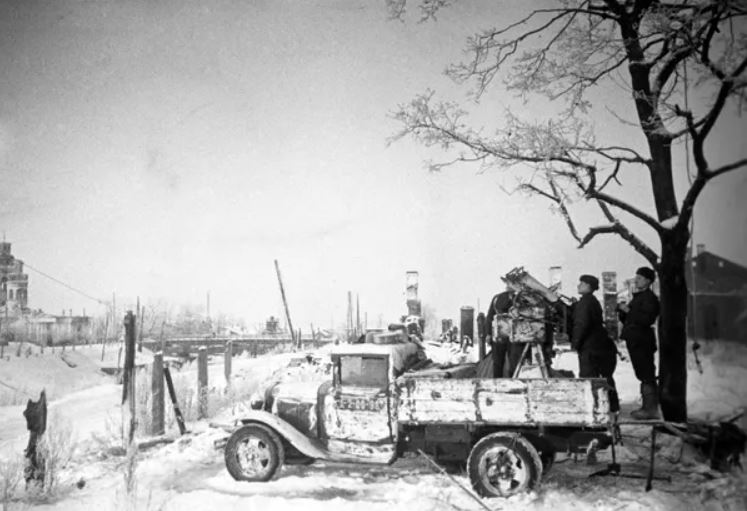 Việc giải phóng Shlisselburg ngày 18 tháng 1 năm 1943 đã trở thành kết quả chính của chiến dịch tấn công "Tia lửa" do quân đội Xô-viết tiến hành. Lực lượng tham gia là Phương diện quân Leningrad và Phương diện quân Volkhov, đạt bước nhảy vọt là vỡ vòng vây Leningrad. Ảnh chụp kíp chiến đấu của súng phòng không M4 (hệ thống Maxim) của Liên Xô trên thùng xe tải GAZ-AA đang quan sát trong thành phố Shlisselburg vừa được giải phóng. Bên trái là Nhà thờ Thánh Truyền tin Blagoveshchensky bị phá huỷ. © Sputnik / Alexander Brodsky