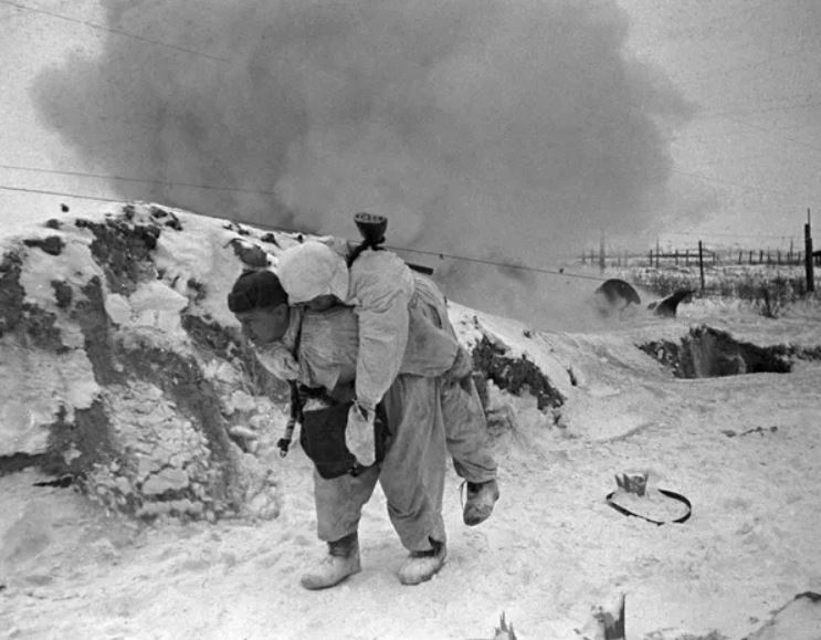 Một nhân viên y tế Liên Xô cõng chiến sĩ bị thương rời khỏi chiến trường trong trận chiến