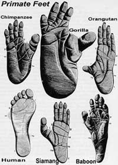 Các kiểu bàn chân: Tinh tinh, khỉ đột, đười ươi, con người, vượn, khỉ đầu chó (từ trái qua phải, trên xuống dưới)