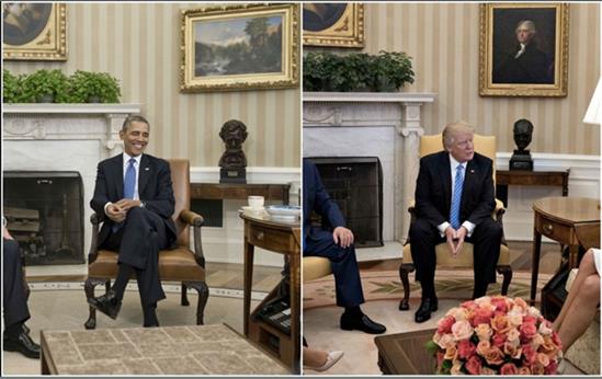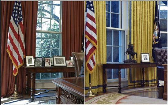 Nổi bật nhất là rèm cửa: Trong khi ông Obama chọn rèm vuông vức màu đỏ mộc mạc, ông Trump đổi sang rèm gấp tròn viền xanh lam và tổng thể màu vàng ánh kim.