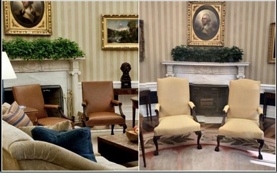 Đồ gỗ ông Obama chọn là ghế bành da. Ông Trump cho bọc thêm vải màu vàng nhạt, làm nổi thêm khung ảnh vàng bên trên lò sưởi, và tương đồng với phong cách chung của ông Trump.