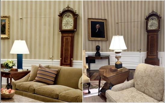 Ông Trump giữ lại cái đồng hồ cổ và bàn nhỏ cạnh ghế, nhưng thay cái đèn xanh đơn giản của ông Obama. Bộ sofa màu kem có phần thoải mái của người tiền nhiệm được đổi sang bộ mới có hoa văn chi tiết.
