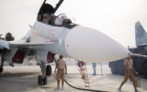 Các kỹ thuật viên đang "chăm sóc" một chiếc chiến đấu cơ của Nga. Ảnh AP
