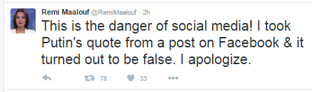 "Mạng xã hội thật là nguy hiểm! Câu trích dẫn của Putin được tôi lấy từ một bài đăng trên Facebook, điều đó thực sự là một sai lầm. Tôi xin lỗi."