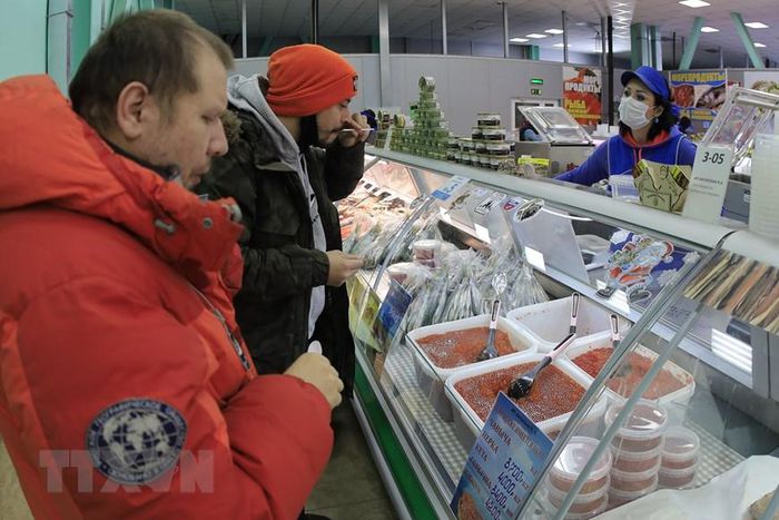 Du khách mua sắm tại chợ hải sản Kamchatka. (Ảnh: Trần Hiếu/TTXVN)