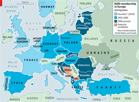 Bản đồ các thành viên NATO ở châu Âu, màu xanh là các thành viên chính thức còn màu cam là các thành viên tiềm năng sẽ gia nhập trong tương lai. Nguồn: Static-economist