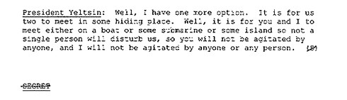 Ông Yeltsin đã đề nghị Mỹ rất nhiều thứ, từ việc ủng hộ cuộc bầu cử Tổng thống Nga năm 1996 cho đến lời hứa rằng việc mở rộng Tổ chức Hiệp ước Bắc Đại Tây Dương (NATO) sẽ không xâm lấn vào lãnh thổ của các nước Cộng hòa thuộc Liên bang Xô viết cũ.