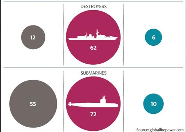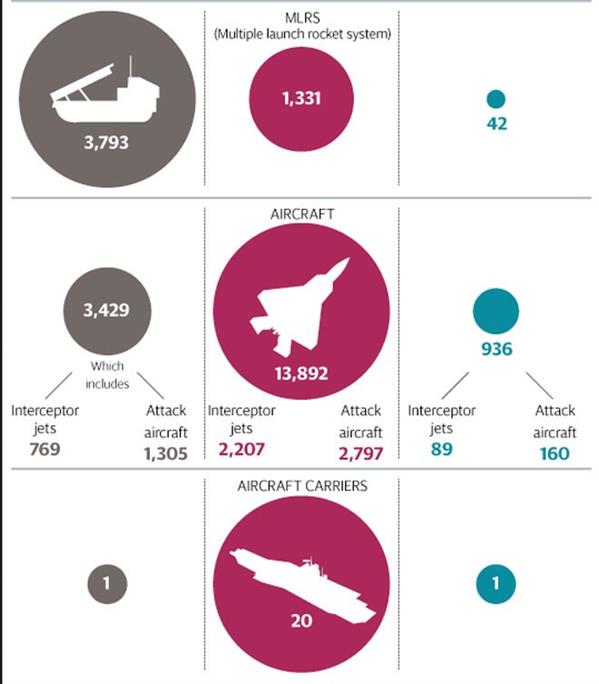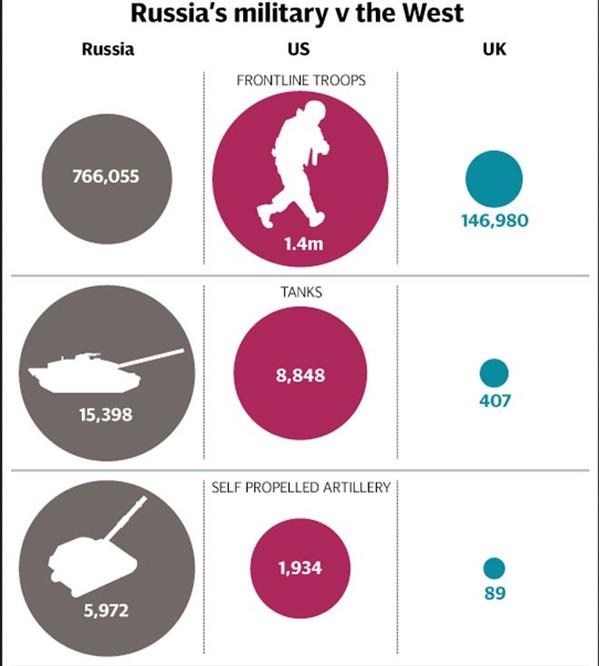 Bảng so sánh sức mạnh quân sự Nga - Mỹ - Anh. Hàng ngang từ trên xuống: Quân thường trực, xe tăng, pháo tự hành, hệ thống phóng tên lửa MLRS, máy bay, tàu sân bay, tàu khu trục, tàu ngầm.