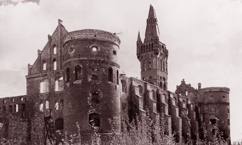 Cảnh pháo đài Ordensburg đổ nát trong Thế chiến II.