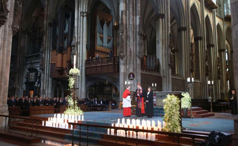 Đúng 12 giờ trưa, những hồi chuông thánh đường vang lên ngân nga gọi lễ, người dân đã đến chờ từ 8 giờ sáng để được vào dự lễ. Tổng thống Đức Joachim Gauck và thủ tướng Đức Angela Merkel đã được bà chủ tịch hội đồng bộ trưởng tiểu bang Nord RheinWestfalen (NRW) Hanelore Kraft đón tiếp tại thánh đường.